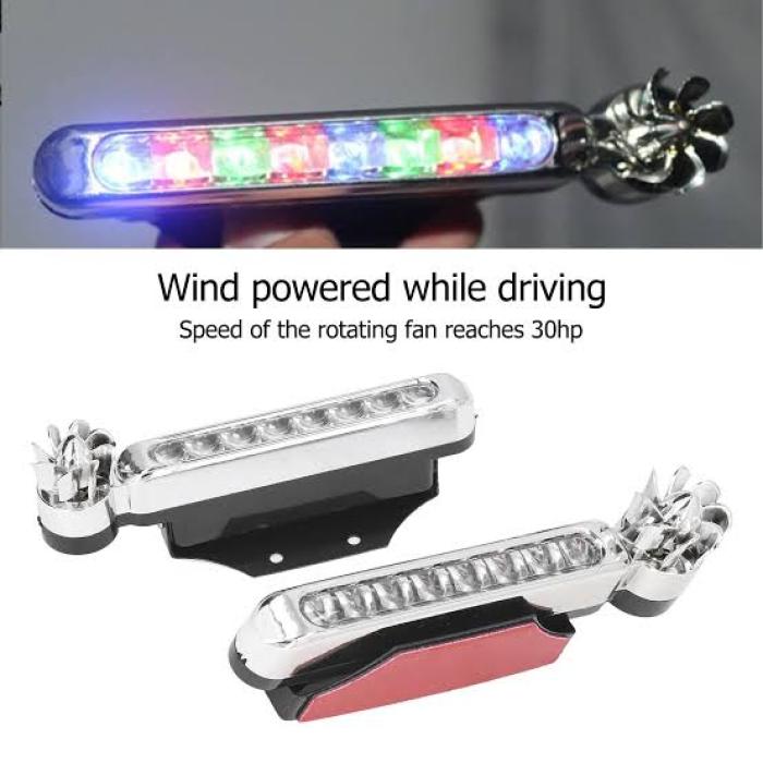 Wind-powered LED lights enhance vehicle visibility.