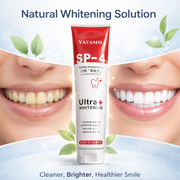 দাঁত হবে সাদা, নিঃশ্বাস থাকবে সতেজ! দাঁতের দাগ, হলদে ভাব বা দুর্গন্ধে বিরক্ত? এখনই ব্যবহার করুন SP-4 প্রোবায়োটিক হোয়াইটেনিং টুথপেস্ট – প্রাকৃতিক উপাদানে তৈরি কার্যকর ফর্মুলা।